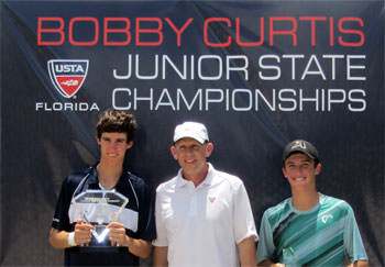 From left: 2013 USTA Florida “Bobby Curtis” Junior State Boys’ 16s champion Alfredo Perez, Tournament Director Andy Gladstone, runner-up Chase Colton