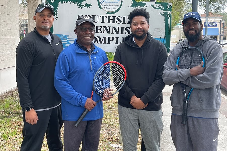 Harrell Thomas with former students from L-R: William Kitchings, Devin Reddick, Mark Atkinson. Kitchings now works as a Recreation Specialist for the City of Jacksonville, Reddick is now a Tennis Professional with the City of Jacksonville, and Atkinson is the Head Tennis Professional with the MaliVai Washington Youth Foundation