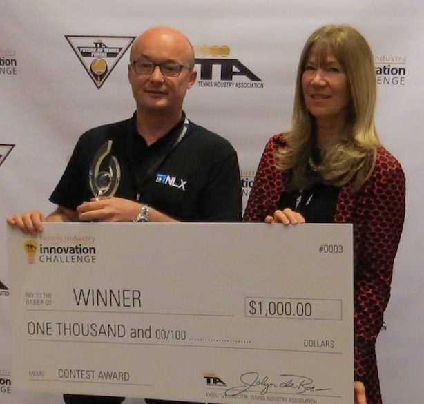 Tweener Lighting System CEO Florent Colliau receives the top prize in the third edition of the Tennis Industry Innovation Challenge from Jolyn de Boer, the executive director of the Tennis Industry Association