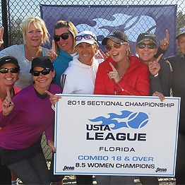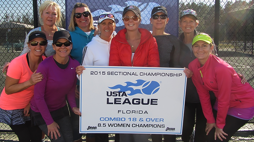 Alachua County (Jonesville Tennis Center, Gainesville), Lee/Charlotte counties (Cape Coral Racquet Club), Marion County (Ft. King Tennis Center, Ocala), and Orange/Seminole counties (Red Bug Lake Park, Casselberry) won USTA Florida League Sectionals titles over the weekend at the USTA Florida Combo 18 & Over 6.5/8.5 League Sectional Championships, held Jan. 22-24, 2016 at the Florida Tennis Center in Daytona Beach.