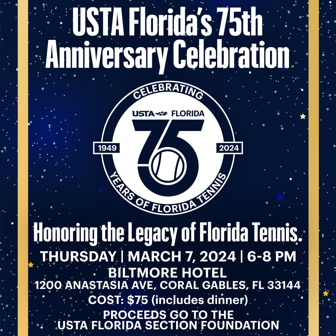 USTA Florida is proud to host our first 75th Anniversary Celebration in Miami on March 7th. This event will take place at the Biltmore Hotel in Coral Gables from 6pm to 8pm. Mary Joe Fernandez will be our featured guest, and we will be paying tribute to many legends who have helped shape Florida tennis through the decades.