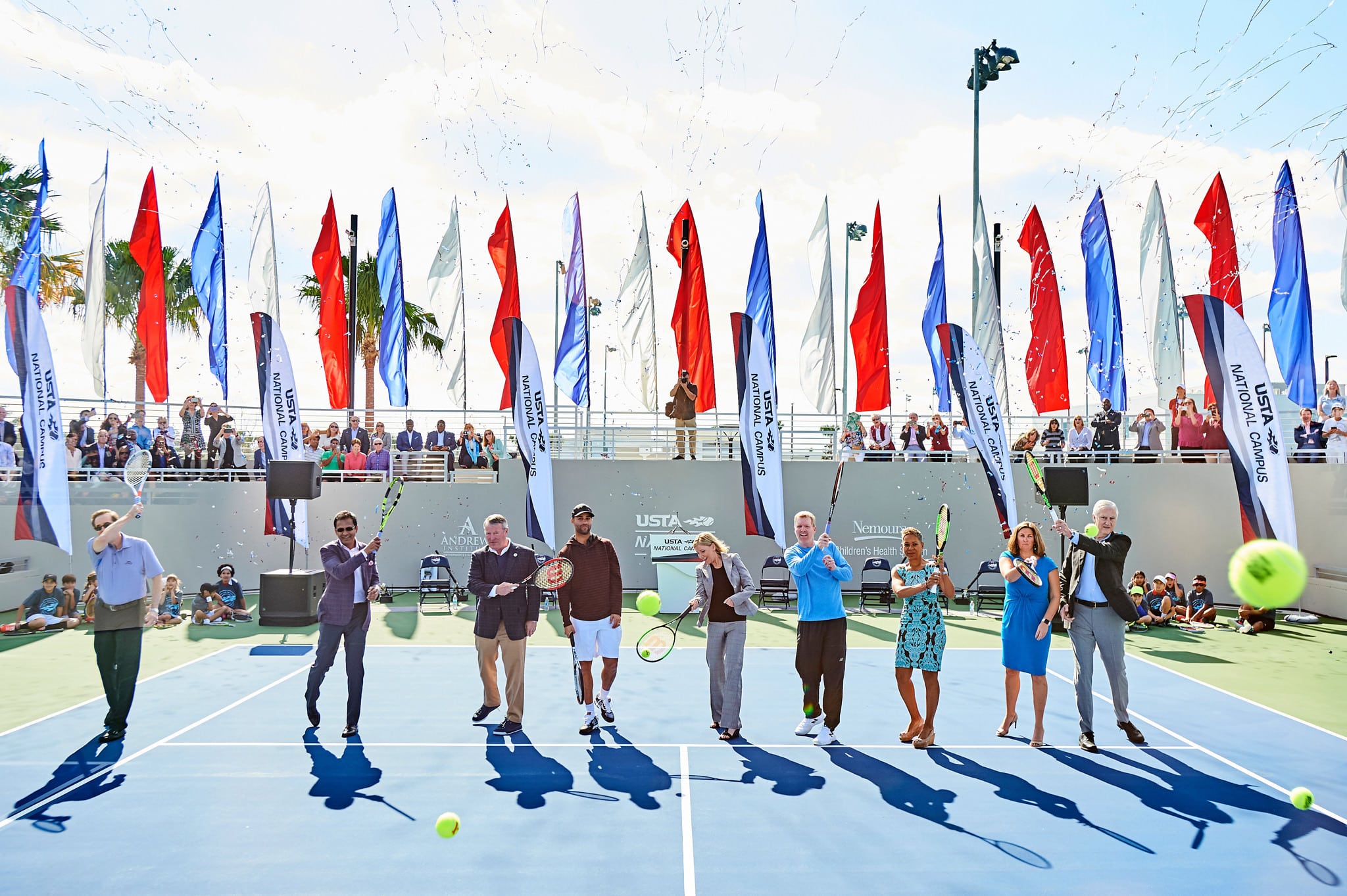 Kurt Kamperman, Chief Executive of USTA Community Tennis and National Campus, Sesh Thakker of Tavistock, Mayor Buddy Dyer of the City of Orlando, James Blake, USTA Foundation Chairman of the Board, tennis legend Chris Evert, U.S. Davis Cup Captain Jim Courier, USTA Chairman of the Board and President Katrina Adams, Orange County Commissioner for District 4 Jennifer Thompson and USTA Executive Director and Chief Operating Officer Gordon Smith take their “First Serve” at the USTA National Campus at Lake Nona in Orlando