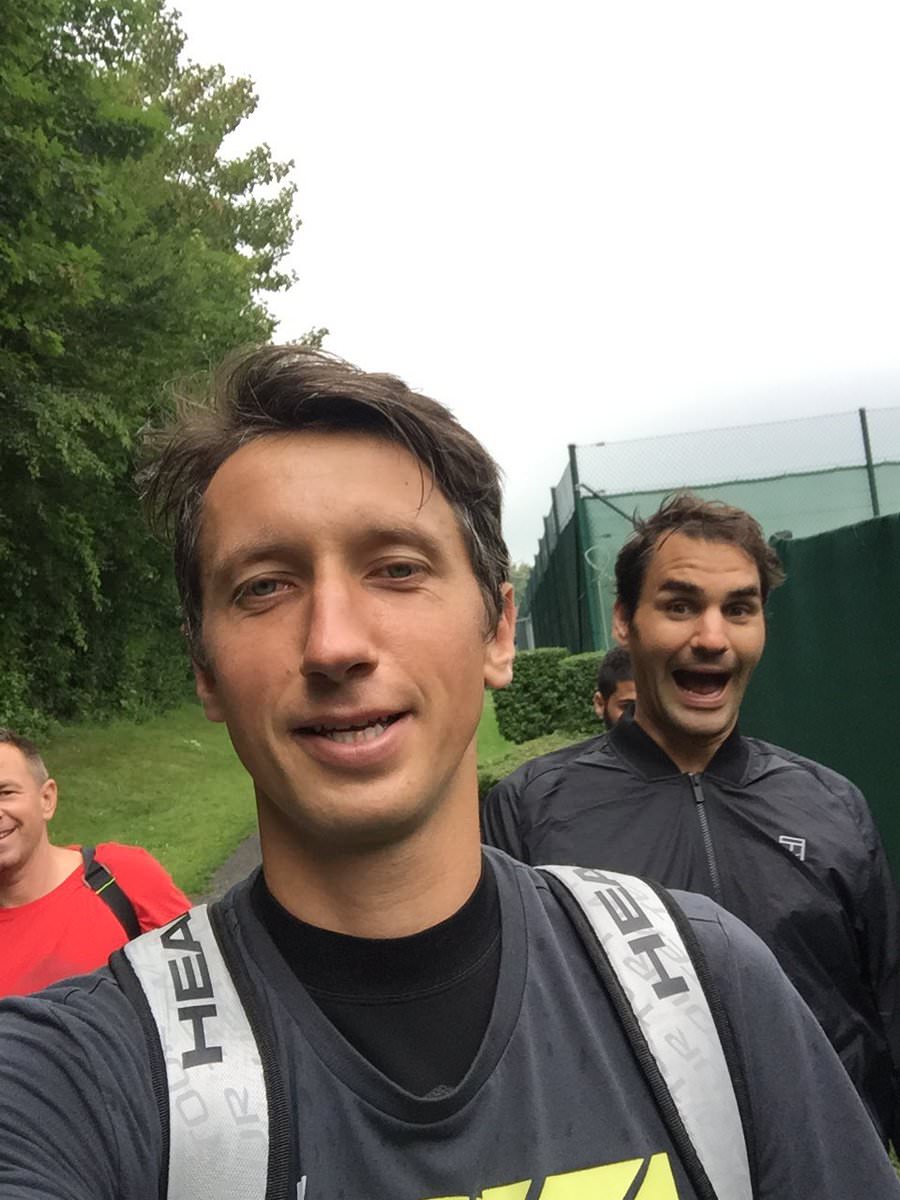 Roger Federer hams it up during a rain delay this week at Halle