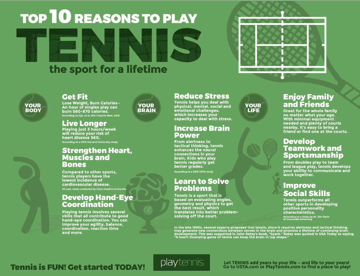 Multiple studies show tennis is one of the best sports for health, at any age. A one-hour match burns 580-870 calories, in addition to helping reduce stress.