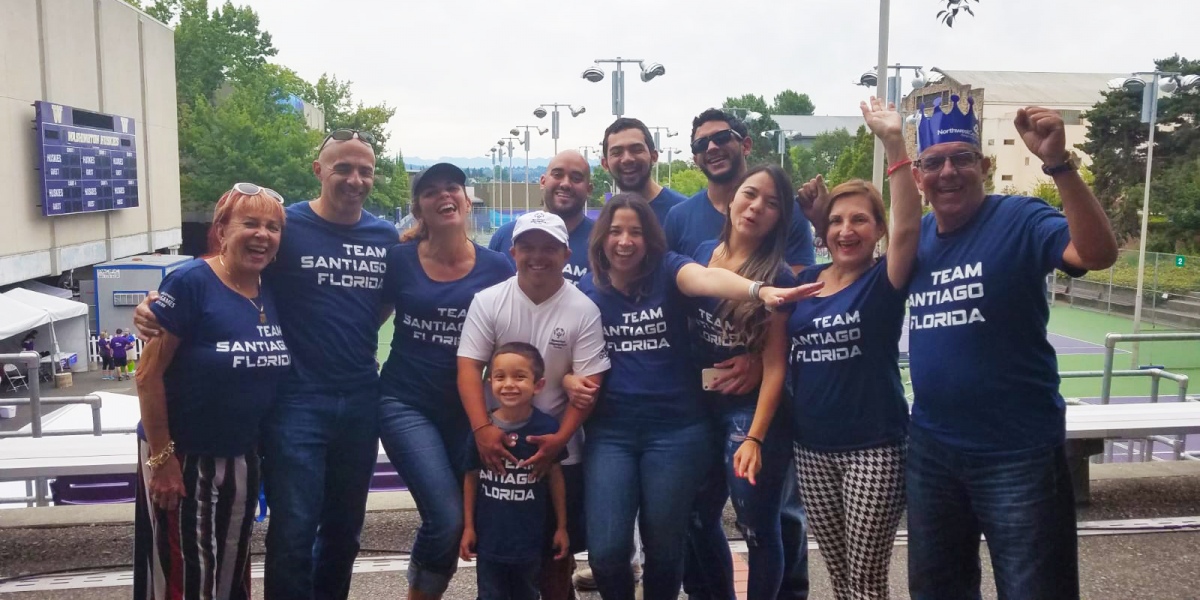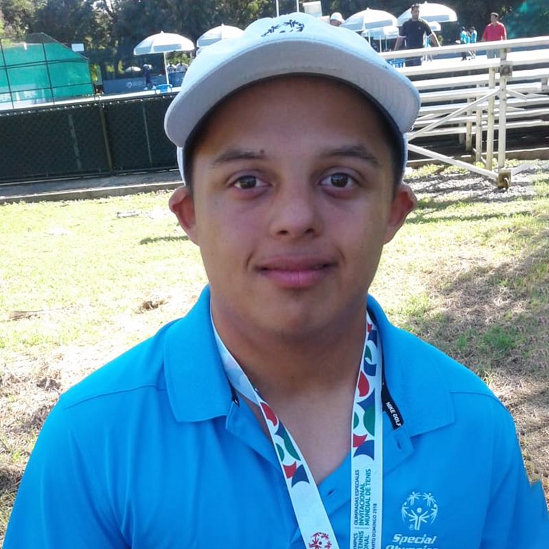 Queremos presentarles a Santiago Castro de 23 años. Él ha jugado tenis por 13 años es parte del equipo de líderes de las Olimpiadas Especiales. Santiago nació en Colombia, Sur América y ha vivido en Miami los últimos 20 años.