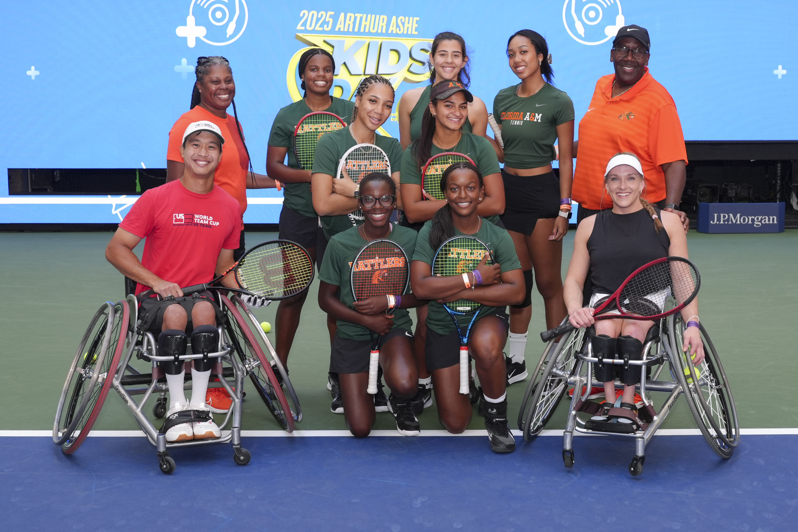 Jason Keatseangslip and Lauren Haneke-Hopps pose for a photo with HBCU players representing both FAMU — as part of the continued celebration of the 20th Anniversary of Wheelchair Tennis during Arthur Ashe Kids’ Day at the 2025 US Open, Saturday, Aug. 23, 2025 in Flushing, NY. (Darren Carroll/USTA)
